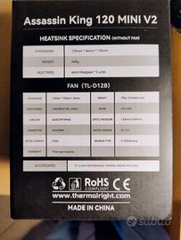 THERMALRIGHT Assassin King 120 mini V2 - Una delle poche soluzioni efficaci disponibili per i case con dimensioni ridotte: Supporto slot di raffreddamento del computer: Intel/amd: LGA1150/1151/1155/1156/1200/1700/17XX; AMD: AM4/AM5; Dimensioni: 120 (L) x 71 (L) x 135 (H) mm (4,72 x 2,8 x 5,31 pollici); Materiale del radiatore: alluminio. Velocità ventola (RPM): 1500RPM±10%;Rumorosità ≤ 28,2 dB (A),collegamento 4 pin PWM. Loggetto è praticamente nuovo,utilizzato un mese circa per poi passare a un raffreddamento AIO per cambio cpu x3d. Usato per raffreddare un ryzen 7 5700x, molto silenzioso ed efficace, mantenendo temperature ottime (in idle 30/35°, in game mai sopra i 65°.