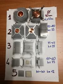 Vendo solo in blocco i dissipatori in immagine, usati ma in ottime condizioni. Nucleo in rame massiccio e alettatura in lega d'alluminio o interamente in lega.