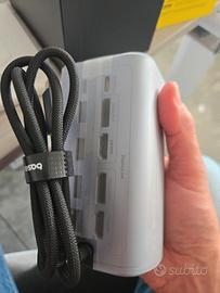 Docking station 12 in 1: tutte le porte principali in un hub compatto: 2× HDMI, 2 × DisplayPort, 2 × USB-C (10 Gbps), 2 × USB-A (5 Gbps), 2 × USB-A 2.0, 1 × USB-C-PD (100 W) e 1 × Gigabit Ethernet, perfetta per un lavoro ordinato.