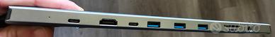 Docking Station USB con 3 porte USB-A e 1 USB-C, HDMI 4K/30Hz, Ethernet, slot SD/TF, uscita audio. Corpo in alluminio, fornita con 2 supporti laterali che consentono di usarla come base per rialzare un portatile/tablet, migliorando la dissipazione. Plug & Play, non sono richiesti driver. Con scatola. Alimentatore non compreso (la confezione non lo prevedeva), ma è consigliabile utilizzarlo per esempio se si collegano più periferiche, hard disk o monitor esterni, etc.