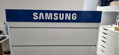 Si vende espositore Samsung, mobile su ruote, con doppia faccia dogata con porzione superiore pubblicitaria Samsung illuminata a LED. si regalano anche chiodi espositivi per posizionamento appenderia varia. possibilità di visionare il prodotto, e ritiro a mano a Palermo.