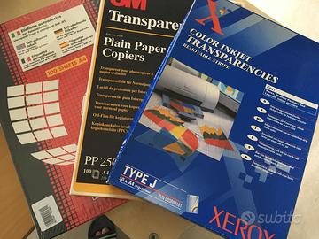 Lucidi da proiezione per fotocopiatura “3M” (pellicola trasparente) – (PP 2500 confezione contenete n. 90 fogli circa, fogli A4 (210 mm x 297 mm). Scritta nera su fondo trasparente;