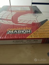 Etichette autoadesive bianche “MARKIN” adesivo permanente 70x36. Confezione (nuova e sigillata) n. 100 fogli A4, etichette per foglio n. 24. Possono essere utilizzate per spedizioni, per personalizzare raccoglitori ed ogni altro materiale per archiviazione o etichettare ogni tipo di prodotto. Stampabilità: INKJET, LASER e FOTOCOPIATRICI.