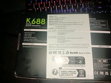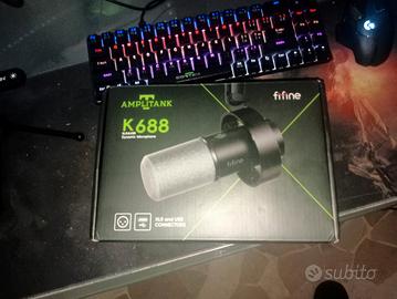 Vendo causa pentimento ( mi sono pentito di averlo comprato) il mi microfono della fifine modello K688, il microfono può essere usato sia in USB ( cavo originale incluso), sia in Xlr, ha la possibilità di regolare il volume in ingresso e vi ha l'ingresso jack. Cedo anche il treppiedi ( perché, quando lo comprate dal sito non vi danno nessun supporto, per fortuna o sfortuna, di treppiedi né sono pieno in casa). Posso spedire.