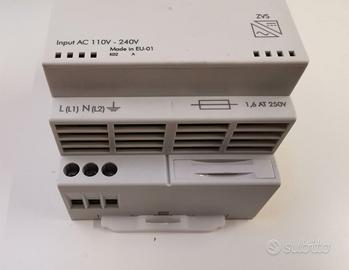 Alimentatore switching ad alta efficienza per applicazioni elettriche ed elettroniche, con tensione di uscita regolabile e protezione contro i sovraccarichi e i cortocircuiti. Design modulare a basso profilo per installazione su guida DIN in quadri elettrici. Dispone di una funzione carica batterie per garantire una totale affidabilità ai sistemi collegati collegando una batteria in parallelo all'uscita (vedi esempi applicativi nel pdf allegato). Protetto in ingresso da fusibile sostituibile direttamente da pannello frontale. Adatto per tutte le applicazioni in DC in cui sia necessario garantire un backup di alimentazione anche in caso di black-out o di interruzione dell'alimentazione di rete