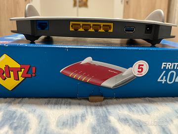 Router FRITZ!Box 4040 in rosso e argento. Ideale per la connessione via cavo/DSL o rete. - Router WLAN. - Porta Gigabit-WAN. - WLAN fino a 866 Mbit/s. - Include alimentatore e manuali.