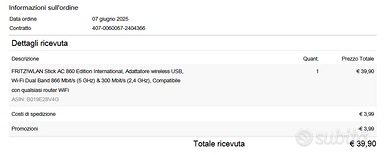 Vendo FRITZ!WLAN Stick AC 860, adattatore wireless USB, Wi-Fi Dual Band 866 Mbit/s (5 GHz) & 300 Mbit/s (2,4 GHz). L'oggetto è stato comprato a giugno 2025 su Amazon (allego ricevuta d'acquisto) ed è tuttora in perfetto stato. Posso consegnare a mano nell'intera provincia di Pistoia o spedire con TuttoSubito. Accetto contanti, ricarica PayPal o bonifico bancario. Per qualsiasi domanda, foto o proposta non esitate a contattarmi.