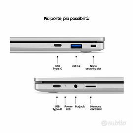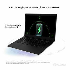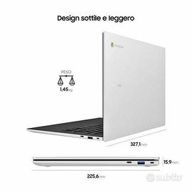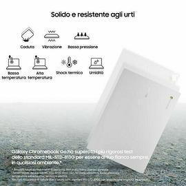 SAMSUNG GALAXY CHROMEBOOK GO Notebook da 14'' Descrizione Processore Intel® Celeron-N4500 (1.1 GHz - 4 MB L3) RAM: 4 GB - Display: 14'' LED HD Ready WiFi IEEE 802.11a/b/g/n/ac/ax - Bluetooth 5.1 Chrome OS - Scheda grafica: INTEL UHD Graphics Condivisa Portalo ovunque ci sia qualcosa da imparare Design ultrasottile e scocca argentata, Galaxy Chromebook Go è lo strumento ideale per gli studenti sempre in movimento, che preferiscono un'esperienza di apprendimento dinamica. Solido e resistente agli urti Solido e resistente agli urti, è dotato di una tastiera a prova di schizzi e di altre caratteristiche che garantiscono la massima affidabilità dentro e fuori dalle aule. Cerniera a 180° per un'interazione a 360° Condividere e-book, opuscoli digitali e app di apprendimento creativo non potrebbe essere più facile di così: la cerniera di Galaxy. Tutto il sapere a tua disposizione con Wi-Fi 6 La connettività Wi-Fi CERTIFIED 6(TM). Tutta l'energia per studiare, giocare e non solo Nemmeno una lunga giornata di lezioni può spaventare la batteria di Galaxy Chromebook Go, che con una sola carica raggiunge un'autonomia di 12 ore. In più, con il caricatore USB-C universale fornito in dotazione puoi caricare altri dispositivi Galaxy, come smartphone e tablet. Più porte, più possibilità Proiettato alle tecnologie di oggi e di domani, Galaxy Chromebook Go è dotato di numerose interfacce, fra cui una porta USB Tipo C e USB 3.2, un jack e uno slot per schede di memoria, per supportare app multimediali, hard disk esterni, visualizzazione multischermo e tutte le soluzioni di apprendimento più all'avanguardia.