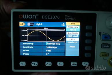 generatore di funzioni owon dge 2070 di forme d'onda frequenza oscillatore onda sinusoidale onda quadra Caratteristiche del prodotto + Uscita di frequenza 35 MHz/70 MHz + Velocità di campionamento massima 300 MSa/s, risoluzione verticale 1μHz + Risoluzione verticale a 14 bit, lunghezza della forma d'onda Arb 8K + Uscita completa della forma d'onda: 5 forme d'onda di base e 150 forme d'onda arbitrarie integrate + Funzioni di modulazione complete: AM, FM, PM, FSK, Sweep e Burst + SCPI supportato + LCD da 3,6 pollici (480 × 260 pixel) praticamente nuovo usato si e no 2 ore, si tenga presente che qui non siamo dal grande ecommerce del nuovo che uno lo prova lo vede e se non gli va bene fa chiamare il corriere per il ritiro a spese degli altri, poi se gli servono soldi lo rende tanto lo puo' tornare a ricomprare quando vuole, qui si parla di oggetto USATO visto e piaciuto senza garanzia come da foto e non si fanno resi , oppure si viene in qua' e si prova dal vero ATTENZIONE PENSATECI BENE prima di fare l'acquisto saluti