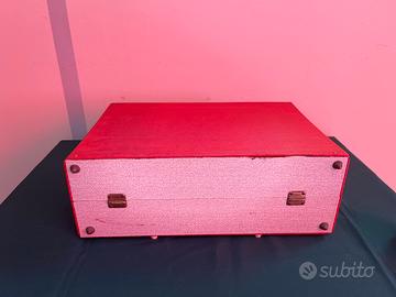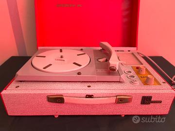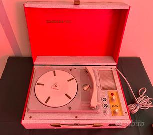 (problema di audio, )Girasischi Lesa Dorik in condizioni estetiche più che buone, visto l’età. Come potete vedere dalla foto che lo rappresenta aperto è perfetto sia esteticamente che come funzionalità. È stato provato mandando il braccio indietro per farlo partire mettendo un disco di 33 giri però non si sente l’audio e lo si sente solo nella puntina che appare buona però non so effettivamente se è un problema di quest’ultima. Da puntina può essere girata con una levetta che ne fa comparire un’altra, ma non me ne intendo molto. Quindi funziona tutto: il piatto gira bene, il braccio scatta bene sia per farlo partire che per farlo fermare, tutte le manovelle sono tenute molto bene e non c’è nulla di rotto. Io credo che chi sia abituato a queste cose abbia già capito quale possa essere il problema credo facilmente risolvibile.