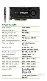 Vendo scheda grafica Nvidia Quadro K4200 da 4Gb, usata e perfettamente funzionante. Gpu pulita e sostituita pasta termica. Se avete bisogno di un cavo video, indicatemi quale e vi fornirò 1 in regalo. ---Prezzo trattabile--- Capacità: 4 GB GDDR5 Interfaccia memoria: 256-bit Uscite Video: 2x DisplayPort 1.2 + 1x DVI-I (Dual Link) Risoluzione Massima DP 1.2: 3840 x 2160 (4K) a 60 Hz Risoluzione Massima DVI-I: 2560 x 1600 a 60 Hz Supporto Multi-Display: Fino a 3 monitor diretti (4 con hub DisplayPort 1.2 MST) Form Factor: Single Slot, Full Height TDP (Consumo massimo): 108 W Connettore di alimentazione: 1x 6-pin PCIe Usata per Autodesk AutoCAD, SolidWorks e Photoshop ecc.. Ottimo anche per gaming. Usata per GTA 5, Red Dead Redemption 2, Cyberpunk, Fortnite ecc.