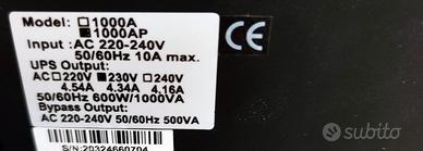 Gruppi di continuità Groups 1000AP perfettamente funzionant1, potenza 1000 VA (700W), tipologia "Line Interactive", stabilizzazione con sistema AVR, controllo a microprocessore, forma d'onda Step-Wave (pseudosinusoidale).Senza batterie ma testati e funzionanti. Completo di cavi alimentazione/usb e software di monitoraggio.40 Euro Cadauno per 3 pezzi 100€