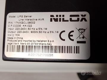 Gruppo di continuità UPS Nilox Mod 17NXGCLI38002. 1900 VA, Icw 1kA, 220-240 V, 50 Hz. Dimensioni cm 14x20x32. Peso 10,5 Kg. Il prezzo esposto include l’acquisto e il montaggio a mia cura di batterie nuove con rilascio del relativo scontrino a testimoniare la data di acquisto e a garanzia del 100% di efficienza e rendimento anche se l’apparecchio è stato usato pochissimo.