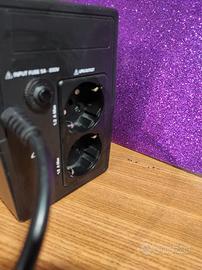 Il prodotto nell'immagine è un gruppo di continuità (UPS) Tecnoware ERA PLUS 750. Potenza: 750 VA / 525 W. Funzione: Protegge dispositivi come PC, modem e sistemi di videosorveglianza da blackout e sbalzi di tensione. Caratteristiche: Tecnologia Line Interactive con stabilizzatore di tensione AVR Plus. Connessioni: Dotato di due prese di uscita di tipo Schuko. Autonomia: Fino a 10 minuti con 1 PC o 40 minuti con modem router, a seconda del carico. Vendita diretta con verifica . Bisogna cambiare la batteria.