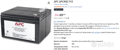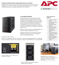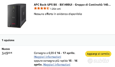 Gruppo di continuità (UPS) marca APC, modello BX1400UI, 1400 VA, in ottime condizioni come da foto, SENZA batteria, acquistabile a parte al costo di circa 70 euro su Amazon (vedi screenshot) o anche meno altrove (si chiama APCRBC113). APC è il leader nel settore degli UPS, niente a che vedere con i modelli economici che, una volta esaurita la batteria, vi costringono a buttare tutto e comprare un nuovo UPS perché la batteria NON è sostituibile. Questo modello invece è fatto per essere aperto e sostituire la batteria: fatto questo torna a funzionare come nuovo. Considerate che le batterie degli UPS possono durare al massimo 5 anni ma di solito durano molto meno (la mia esperienza è di 2-4 anni), quindi acquistare un modello come questo che ne consente la sostituzione è sicuramente una scelta intelligente, perché le batterie costano molto meno degli UPS (anche di quelli economici). Nel momento in cui scrivo, questo modello APC costa su Amazon circa 350 euro più spese di spedizione (vedi screenshot). Io lo vendo a 149, il che significa che con 149+70=219 euro avrete un gruppo perfettamente funzionante come nuovo. Compresi nel prezzo: cavo per collegare il gruppo alla presa di corrente e 2 cavi per collegare le periferiche al gruppo (uno per il pc e l'altro per il monitor). Si tratta comunque di cavi standard, quindi se ve ne servono di più potete comprarli ovunque. Allego foto del gruppo, delle caratteristiche e delle batterie (non incluse). Pagamento in contanti al ritiro a Roma.