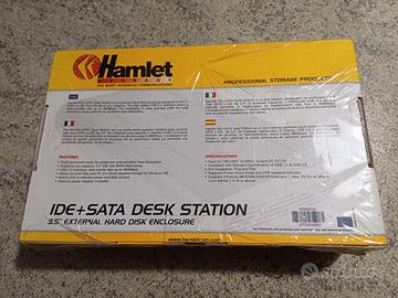 Hamlet IDE+SATA Desk Station è un box esterno disegnato per contenere Hard Disk SATA e IDE da 3,5" di qualsiasi capacità. L'interfaccia USB 2.0 ad alta velocità permette di raggiungere una velocità di trasferimento dati fino a 480Mbps. L'installazione è semplice e veloce mentre la solida struttura in alluminio permette una eccellente dissipazione del calore.