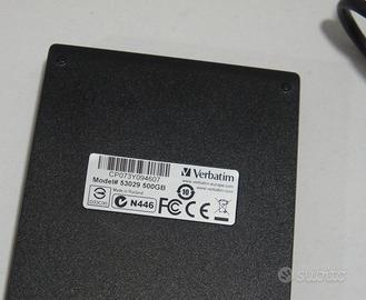 Hard Disk Verbatim, modello USB 3.0 autoalimentato, 500GB di spazio di archiviazione.