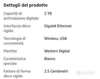 Vendo hard disk esterno marca Western Digital, capacità 2Tb. Interfaccia disco rigido : gigabit ethernet. Connettività: wireless, usb. Fattore di forma disco rigido: 2,5 centimetri. Utilizzo anche con my cloud. Completo si scatola e tutti gli accessori.