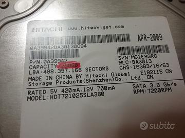 Lotto di 2 hard disk interni Hitachi Da 250 gb Usati poco ma puliti Al costo di 13 e cad uno Ritiro o spedizioni 9 e