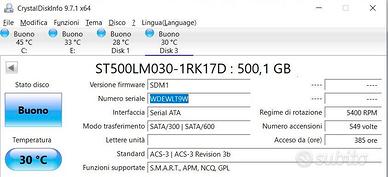 HARD DISK INTERNO SATA 2.5" SEAGATE 500 Gb Usato Ottime condizioni Testato con Seatools (zero errori) e Crystal Disk (stato Buono)