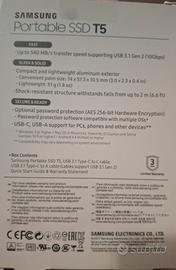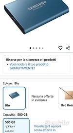 samsung portable ssd t5 500gb nuovo mai usato. confezione originale. in perfetto stato. supporta USB 3.1 generazione 2 (10 gbps) compatto in alluminio colore azzurro memoria per pc/windows/ios/Android