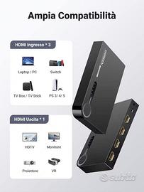GREEN 40234, HDMI Switch 4K, Commutatore HDMI 3 In 1 Out con Telecomando (batteria telecomando non inclusa)Wireless IR per PS3, PS4,PS5 Xbox One,X,S, TV Stick, PC, TV ecc..Spedisco solo tramite, subito, no perditempo o proposte assurde, prezzo è definitivo e non trattabile. Non risponderò a offerte inferiori