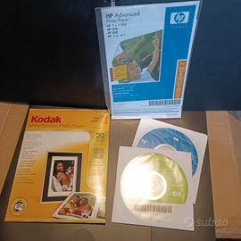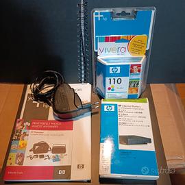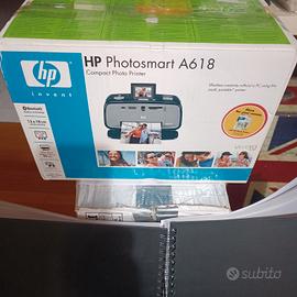 HP Photosmart A618, una stampante fotografica compata con batteria per renderla portatile, cartuccia nuova ancora sigillata e fogli per stampa.