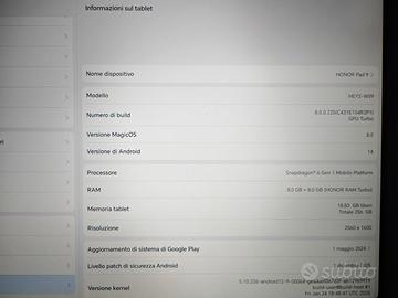 Vendo Honor Pad 9 in ottime condizioni, usato pochissimo, sempre tenuto con cover. Display da 12,1" 2,5K a 120Hz, ottimo per film, serie TV e lettura. Processore Snapdragon 6 Gen 1 e 8GB di RAM, fluido per navigazione, app, studio e lavoro. Memoria interna 256GB, sufficiente per app, documenti e contenuti multimediali. Audio con 8 altoparlanti, molto potente e immersivo. Batteria da 8300mAh con ricarica rapida 35W, ottima autonomia.