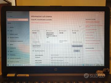 Vendo computer pc portatile HP 15-bw056nl originariamente acquistato nuovo su Amazon a 400€. Il pc è perfettamente funzionante, ho sostituito la memoria SATA con una memoria SSD nettamente migliore e una batteria nuova da 2600mAh con un'ottima autonomia. L'ho usato sia per studio universitario che per lavoro e mi sono sempre trovata bene. A parte qualche graffio e qualche gommina mancante, l'unico difetto è una delle due cerniere rotte, che comunque può essere riparata facilmente. Sollevando un po' lo schermo è possibile comunque aprirlo e chiuderlo completamente. Il pc viene venduto ovviamente con il caricabatterie originale. Di seguito le caratteristiche presenti anche in foto: