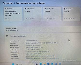 Vendo computer Notebook Laptop Pc Portatile HP 250 G8. Batteria usata al 94%, 38,52Wh su 41Wh. Alimentatore originale HP compreso, presente scatola e imballo. Pronto all'uso, adatto per Photoshop, elaborazione audio/video, ottimo per l'ufficio, per la videoscrittura, internet, youtube, film in streaming, posta elettronica, didattica a distanza, uso domestico. E' molto maneggevole grazie alla linea sottile e al peso di soli 1,7Kg. Sistema operativo: Windows 11 Pro ultima versione 25H2. Tutti i driver aggiornati con utenza di amministratore senza password o PIN. Pacchetto Office Professional Plus 2016 licenziato a vita solo su richiesta dell'acquirente. Disco rigido primario: SSD M.2 MVMe PCIe, 256 GB Solid State Drive Disco rigido secondario: 500GB HDD 2,5" SATA 5400rpm Scheda grafica integrata Intel® UHD Graphics Intel® Core™ i3-1115G4 Processor 3.0 GHz (6M Cache, up to 4.1 GHz, 4 Threads) Memoria RAM 16GB DDR4 3200 MT/s upgradabile a 32GB con prezzo da concordare con l'acquirente. Schermo 15,6" HD (1366 x 768), bordi sottili, antiriflesso, 250 nit, 45% NTSC 1 USB Type-C con velocità di trasmissione di 5 Gbps 2 USB Type-A con velocità di trasmissione di 5 Gbps 1 alimentatore CA 1 HDMI 1.4b 1 jack combinato per cuffie/microfono stereo Scheda wireless Realtek RTL8822CE 802.11a/b/g/n/ac (2x2) Wi-Fi® Ethernet LAN (RJ45) Bluetooth® 5.0 Fotocamera HD da 720p Doppi altoparlanti stereo Tastiera di dimensioni standard, con tastierino numerico Touchpad con supporto gesti multi-touch, tocchi abilitati come impostazione predefinita Tastiera Italiana QWERTY Consegna a mano nella città di Siena. Possibilità di scambio su Arezzo, Firenze, Prato, Pistoia. Col servizio Tuttosubito spedizione in tutta Italia. Non accetto proposte d'acquisto, d'accordo sul prezzo faccio io l'offerta valida per 48ore. Tel. 3501333975
