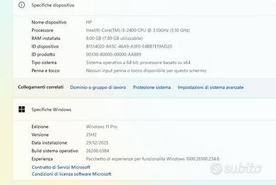HP 8200 elite sff, intel core i5-2400, 8 GB ram, 256 GB ssd, Windows 11 PRO, completo di mouse tastiera e webcam usb, scheda di rete wifi usb, monitor iiyama 20 pollici 16/9 e cavi elettrici/video.