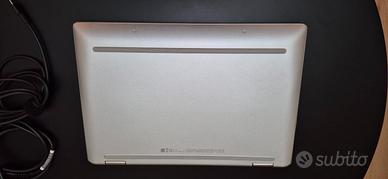 È pari al nuovo, non ha alcun segno poiché usato pochissimo, touch screen e può ingrandire le immagini nel display. Lo schermo è completamente richiudibile per poterlo utilizzare come tablet. Provvisto di alimentatore originale. La batteria è perfetta ha una durata di circa 10 ore. Molto leggero, sottile e molto performante