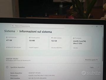 Hp EliteBook 640 G11 Notebook Display 14" Full HD 16:10 Intel Core Ultra 5 RAM 16 GB DDR5 SSD 512 GB Windows 11 Pro Argento. Aperto - usato per caricare sistema operativo : Si tratta di un oggetto nuovo in condizioni eccellenti, privo di segni di usura.confezione o nell'imballaggio protettivo originale. L'oggetto include gli accessori originali. HP EliteBook 640 G11 Notebook professionale da 14" progettato per ambienti aziendali con componenti aggiornati, sicurezza avanzata e chassis compatto. Adatto a utilizzi da ufficio, gestione documentale e applicazioni business. Prestazioni e hardware Dotato di processore Intel Core Ultra 5 125U e grafica integrata Intel Graphics integrata. Configurato con 16GB di memoria DDR5 e unità SSD PCIe NVMe da 512GB per operazioni rapide e fluide. Display e design Schermo da 14" Full HD con pannello antiriflesso. Design solido con scocca in materiali professionali, pensato per garantire durabilità e comfort d’uso prolungato. Connettività e sicurezza Include connettività moderna come USB‑C, HDMI, Ethernet e Wi‑Fi 6E. Integra funzionalità professionali come TPM 2.0 e sicurezza HP avanzata. Componenti inclusiNotebook HP EliteBook 640 G11, caricabatterie, adattatore HDMI-VGA - HP NANO KEYED CABLE LOCK (cavo con Lucchetto a combinazione)