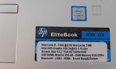 HP Elitebook 830 G5 pc laptop estetica e funzionalità perfette. Intel i5 -7200 Schermo UHD 13.3, Grafica Intel 620, Ram 8 gb DDR4, SSD NVME 250Gb , batteria 100% e caricabatteria. Descrizione in foto n.4. NO offerte a ribasso, NO scambi.