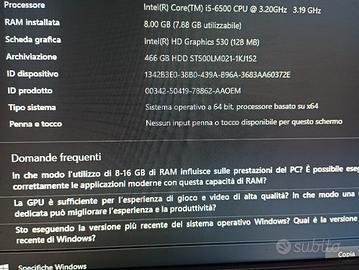 hp all in one processore Intel core i5-6500cpu @3.20 GHz RAM 8GB scheda grafica Intel(r)HD graphicd 530 120mb