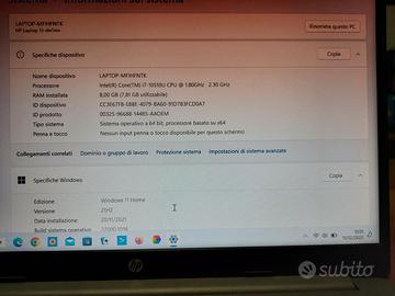 Hp I7 decima generazione con windows 10, aggiornato a windows 11 con SSD da 512 GB, 8 GB di Ram e 2 GB di scheda grafica. Verrà consegnato alle condizioni di fabbrica e non si accettano scambi.