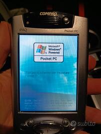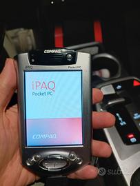 Palmare HP Compact serie H3900 funzionante. Pennino disponibile ma che non rimane nell'alloggiamento. Caricabatterie da rete non disponibile. Caricabatterie da viaggio, tastiera e docking station funzionanti.cover argento. Trail per scheda SD mamcante