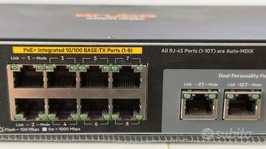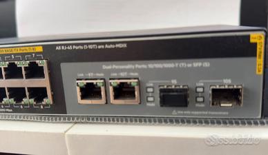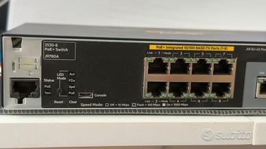 HP - J9780A - HP 2530-8-PoE+ Switch Highlights Numero di porte:8 Velocità della porta:1G Tipo di porta:Rame Uplink Ports (fixed):2x 1G SFP/RJ45 Kombi Layer Type:Layer 2 POE Porti:POE+ General Device Type:Switch - 8 ports - Managed Enclosure Type:Desktop, rack-mountable, wall-mountable 1U Subtype:Fast Ethernet Ports:8 x 10/100 + 2 x Gigabit SFP + 2 x 10/100/1000 Power Over Ethernet (PoE):PoE+ Performance:Throughput: 4.1 Mpps Switching capacity: 5.6 Gbps Capacity:MAC addresses: 16000 MAC Address Table Size:16000 entries Jumbo Frame Support:9220 bytes Remote Management Protocol:SNMP 1, RMON 1, RMON 2, RMON 3, RMON 9, Telnet, SNMP 3, SNMP 2c, HTTP, TFTP, SSH-2, CLI Encryption Algorithm:SSL Authentication Method:RADIUS, TACACS+, Secure Shell v.2 (SSH2) Features:Flow control, DHCP support, BOOTP support, ARP support, trunking, VLAN support, auto-uplink (auto MDI/MDI-X), port mirroring, IPv6 support, half duplex mode, full duplex mode, SNTP support, sFlow, MSTP support, ACL support, QoS, STP Root Guard, LLDP support, CoS, GARP Compliant Standards:IEEE 802.3, IEEE 802.3u, IEEE 802.1D, IEEE 802.1Q, IEEE 802.3ab, IEEE 802.1p, IEEE 802.3af, IEEE 802.3x, IEEE 802.3ad (LACP), IEEE 802.1w, IEEE 802.1x, IEEE 802.1s, IEEE 802.1ab (LLDP), IEEE 802.3at, IEEE 802.3az Processor:1 x ARM: 800 MHz RAM:256 MB DDR3 SDRAM Flash Memory:128 MB Expansion / Connectivity Interfaces:2 x 10Base-T/100Base-TX/1000Base-T - RJ-45 2 x SFP (mini-GBIC) 1 x management RJ-45 8 x 10Base-T/100Base-TX - RJ-45 PoE+ Power Voltage Required:AC 120/230 V (50/60 Hz) Miscellaneous Compliant Standards:FCC Class A certified, CISPR 22 Class A, CISPR 24, EN 61000-3-2, IEC 61000-3-2, IEC 61000-3-3, IEC 61000-4-11, IEC 61000-4-2, IEC 61000-4-3, IEC 61000-4-4, IEC 61000-4-5, IEC 61000-4-6, IEC 61000-4-8, VCCI Class A ITE, EN 61000-3-3, EN55024, EN55022 Class A, UL 60950-1, IEC 60950-1, EN 60950-1, EN 60825, CSA C22.2 No. 60950-1 Dimensions & Weight Width:25.4 cm Depth:15.95 NON TRATTABILE