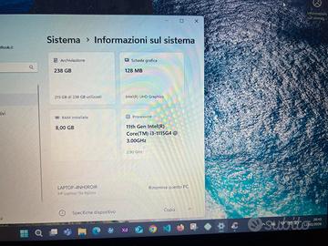 HP Laptop 15s – Intel i3 11ª gen – 8GB RAM – SSD 256GB – Windows 11 Specifiche: ✔ Processore Intel Core i3-1115G4 (11ª generazione) ✔ 8 GB RAM ✔ SSD 256 GB (avvio rapidissimo) ✔ Scheda grafica Intel UHD ✔ Display 15,6” ✔ Windows 11 installato ✔ Webcam, Wi-Fi, Bluetooth Ideale per smart working, studio, navigazione, Office, streaming. Batteria ancora buona, caricatore originale incluso. Pronto all’uso.