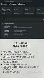 DESCRIZIONE Vendo HP Laptop Notebook Computer PC 15s-eq3008nl in condizioni eccellenti. Computer molto veloce, ideale per lavoro, università e multitasking grazie al processore Ryzen 7 di fascia alta. SPECIFICHE TECNICHE: • PROCESSORE: AMD Ryzen™ 7 5825U (8 Core / 16 Thread) • RAM: 8GB DDR4 • SSD (UPGRADE): 1TB (1000GB) Western Digital Blue SN580 NVMe M.2 (Sostituito all'originale da 256GB SN530 per prestazioni Gen4 e spazio extra) • DISPLAY: 15.6" Full HD (1920x1080) antiriflesso • EXTRA: Lettore impronte digitali, Webcam HD, Wi-Fi/Bluetooth ACCESSORI E DOTAZIONE: • SCATOLA: Originale inclusa • ALIMENTAZIONE: 2 Caricabatterie inclusi (Originale + uno di scorta) • MAGSAFE: Supporto magnetico per iPhone applicato sulla scocca (comodissimo per usare il telefono come webcam o supporto) INFO VENDITA: • PC formattato e pronto all'uso con Windows 11 • Batteria in ottimo stato • Disponibile per prova e visione dal vivo • Ricevuta di acquisto Unieuro Zona: San Benedetto del Tronto o Roma Disponibile spedizione con TuttoSubito