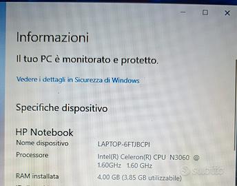 NOTEBOOK HP INTEL CELERON N3060 4GB RAM HD WEBCAM WIFI. 15,6", 500 GB. Vendo per passaggio ad altro PC. Perfette condizioni. Cose da segnalare: potrebbe risultare lento nell'utilizzo. Qualsiasi domanda puoi scrivere