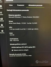 Vendo per inutilizzo. Ottime condizioni. Processore Intel I7 11800H Scheda video Nvidia RTX 3070 SSD 1Tb 16 Gb ram