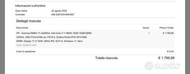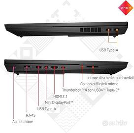 HP OMEN 17-ck0000sl, Intel Core i7-11800H, RAM 16GB DDR4 3200Hz, SSD PCIe NVMe da 1TB M.2, Grafica Nvidia RTX 3070 8GB DDR6, Display 17,3" QHD 165Hz IPS, Wi-Fi 6, Windows 11, Nero Vendo potente portatile da gaming HP OMEN, 17-ck0000sl ideale per chi cerca prestazioni elevate sia in ambito videoludico che professionale. Condizioni: • Tenuto con cura, usato solo in casa o ufficio • Nessun graffio, schermo perfetto, tastiera retroilluminata funzionante al 100% • Sistema operativo pulito e pronto all’uso SISTEMA OPERATIVO: Windows 11 PROCESSORE: è un Intel Core i7-11800H con una velocità fino a 4,6GHz grazie alla tecnologia Intel Turbo Boost, 24 MB di cache L3, 8 core, 16 thread MEMORIA: è dotato di una unità SSD PCIe NVMe TLC M.2 da 1 TB ottimizzata per il gaming, di 16GB DDR4 di Ram SCHEDA GRAFICA: NVIDIA GeForce RTX 3070 8GB GDDR6, permette di sfruttare i giochi più recenti con ray-tracing migliorato e con la potenza di Ampere, l'architettura NVIDIA RTX di seconda generazione SCHERMO: Display da 17,3" con risoluzione QHD (2560 x 1440p) e diagonale da 43,9 cm, IPS, 165Hz, tempo di risposta 3ms, Antiriflesso, Micro-Edge, 300 Nits di luminosità, volume colore 100% sRGB DESIGN: Chassis nero opaco, Prese d'aria su tre lati, Ventilazione a 5 vie, Sistema di Raffreddamento OMEN Tempest Cooling Technology, PORTE: 1 USB Type-C Thunderbolt4 fino a 40 Gbps, 1 Mini DisplayPort, 3 USB Type-A fino a 5 Gbps, 1 HDMI 2.1, Wi-Fi 6, Bluetooth 5.2, 1 RJ-45 Gigabit, 1 Smart Pin CA, 1 cuffia/microfono combinati Inclusi nel prezzo: • Caricatore originale HP Supporta fino a 32 GB di memoria (in due moduli da 16 GB). Quindi puoi tranquillamente portarlo da 16 GB a 32 GB aggiungendo un altro modulo da 16 GB identico a quello già presente oppure sostituendo entrambi i moduli con un kit da 2×16 GB DDR4 3200 MHz. Consegna a mano su Roma, o spedizione tracciata a carico dell’acquirente su pagamento bonifico anticipato. 700€ non trattabili.