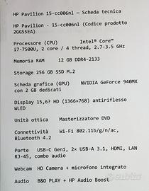 HP Pavilion 15-cc006nl – Intel Core i7 – SSD – 12GB RAM - cod. prodotto 2GG55EA -