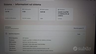 HP Pavilion 15 notebook da Gaming Monitor da 15,6" Processore Intel I7-6700HQ 8 Gb di Ram Nvidia Geforce 950M - 4 Gb dedicati SSD 256 Gb con S.O. Installato mSATA HDD da 1 Tb per archiviazione SATA S.O. Windows 11 Home re-installato pulito in data 12/02/2026 e configurato con tutti i driver e aggiornamenti. N.B. Batteria non funzionante ma si puo' sostitituire il Notebook funziona solo con l'alimentatore. Consegna a mano in zona Bertinoro o Cesena.