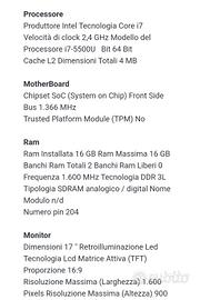 HP Pavilion 17-g106nl, Intel® Core™ i7 di quinta generazione, 2,4 GHz, 43,9 cm (17.3"), 1600 x 900 Pixel, 16 GB, 1000 GB HP Pavilion 17-g106nl. Tipo di prodotto: Computer portatile, Fattore di forma: Convertibile (rimovibile). Famiglia processore: Intel® Core™ i7 di quinta generazione, Modello del processore: i7-5500U, Frequenza del processore: 2,4 GHz. Dimensioni schermo: 43,9 cm (17.3"), Risoluzione del display: 1600 x 900 Pixel. RAM installata: 16 GB, Tipo di RAM: DDR3L-SDRAM. Capacità totale di archiviazione: 1000 GB, Supporto di memoria: HDD. Tipo drive ottico: DVD Super Multi. Scheda grafica integrata. Sistema operativo incluso: Windows 10 Home. Colore del prodotto: Argento N. B. HD sostituito con un prodotto di ultima generazione più veloce prestazioni! Prezzo non trattabile! Per maggiori info guardare requisiti online!