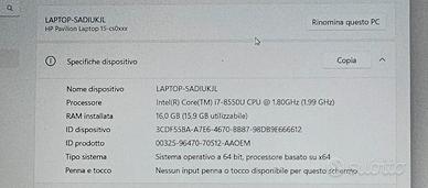 vendo per inutilizzo HP PAVILION LAPTOP 15. Caratteristiche tecniche nell'ultima foto, cavo alimentazione originale, batteria come nuova.