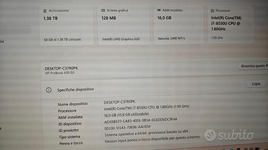 Vendo HP ProBook 430 G5, velocissimo e in ottimo stato Processore Intel Core i7-8550U ottava generazione quad core con 8 thread, velocità fino a 4,0 GHz RAM 16 GB DDR4 2400 MHz enorme SSD da 1 TB M.2 PCIe NVMe velocissimo Schermo 13,3” Full HD IPS opaco Scheda grafica Intel UHD 620 1 porta USB-C 3.1 Gen 1 con supporto Power Delivery e DisplayPort (ricarica, dati e uscita video) 2 porte USB 3.1 Gen 1 Type-A (una con funzione di ricarica anche a PC spento) 1 porta USB 2.0 Type-A 1 porta HDMI 1.4b 1 porta VGA 1 porta Ethernet RJ-45 Gigabit Lettore di schede SD Jack audio 3,5 mm cuffie e microfono WiFi dual band 802.11ac Bluetooth 4.2 Webcam HD integrata audio stereo lettore impronte digitali Batteria da circa 48 Wh con buona autonomia, superiore a 2,5 ore alimentatore originale Ottime condizioni, Scocca molto resistente, mista alluminio e plastica rinforzata Windows 11 aggiornatissimo Nessun conflitto, nessuna anomalia, pronto all'uso Lievissimo graffio su coperchio zona cornice sinistra (difficilmente notabile) Computer ancora molto veloce, grazie al processore, ai 16GB di ram DDR4 e alla tipologia di disco NVMe. Possibilità di testare di persona o anche previo appuntamento, da remoto con teamviewer. Gradita consegna a mano zona Mestre o spedizione con tuttosubito, con imballaggio accuratissimo.