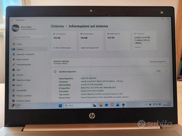 Vendo HP Probook in ottime condizioni generali. Batteria con lunga autonomia. Caricabatterie in dotazione Schermo 14" pollici Processore Intel® Core i7-8565U di 8th GEN. CPU 1.80 GHz 1.99 GHz RAM 16 GB Archiviazione 238 GB SSD Dotata di 3 porte USB. 1 Tipe C. 1 Jack cuffie. 1 porta ethernet. ! slot SD. 1 HDMi. Sistema operativo installato: Windows 11 pro