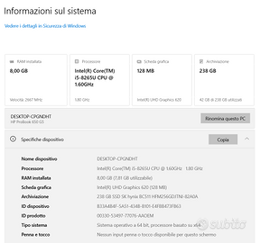 Vendo HP ProBook 650 G5 usato ma perfettamente funzionante. La scocca esternamente presenta qualche segno di usura. La guaina del cavo di alimentazione è danneggiata come da foto, ma l'alimentatore è perfettamente funzionante. Specifiche: Processore: Intel Core i5-8265UU 1.60GHz RAM: 8GB DDR4 2666 MHz Scheda Video: Intel UHD Grafics 620 Risoluzione: 1920 x 1080 Schermo: 15.6 pollici Disco SSD Nvme da 256GB Stato batteria = Buono Prezzo non trattabile, Pagamento tramite Paypal, spedizione in tutta Italia con supplemento di 10€ per i costi di spedizione.